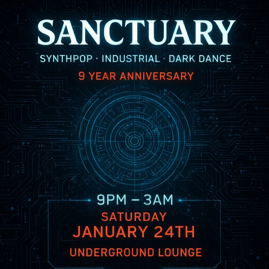 Join us for the upcoming Sanctuary at Underground Lounge. Our DJs will be playing a variety of music that will keep you dancing. This includes, but is not limited to, Synthpop, Industrial, EBM, and Electronic Dance. If dancing isn't your preference or if you need a break, Underground features a full bar that runs the length of the venue. For those who appreciate Craft Beer, there are some great options that you’re sure to enjoy.